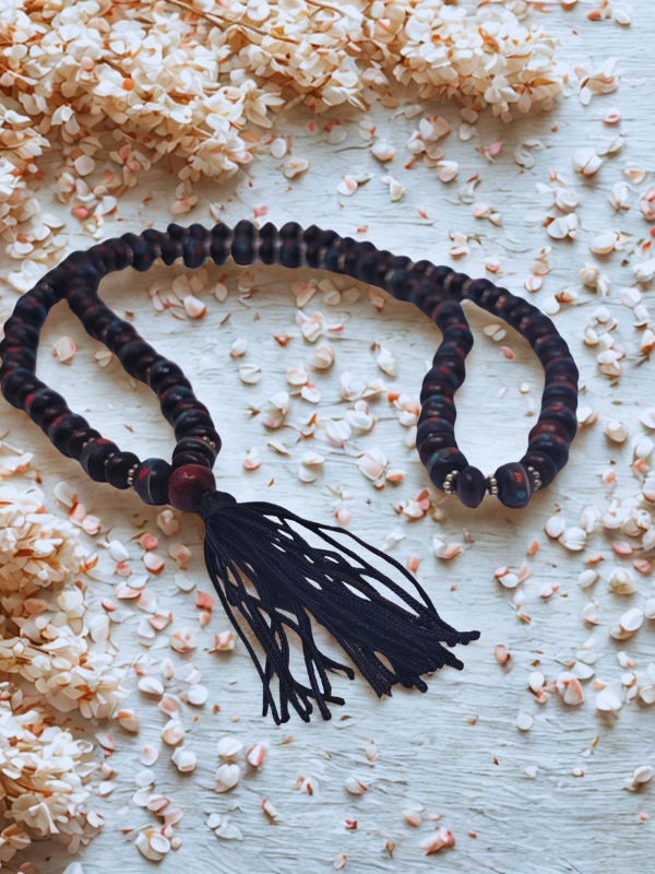 Rosewood and Yak Bone Inlaid with Turquoise and Coral with Cotton Tassel – 8mm