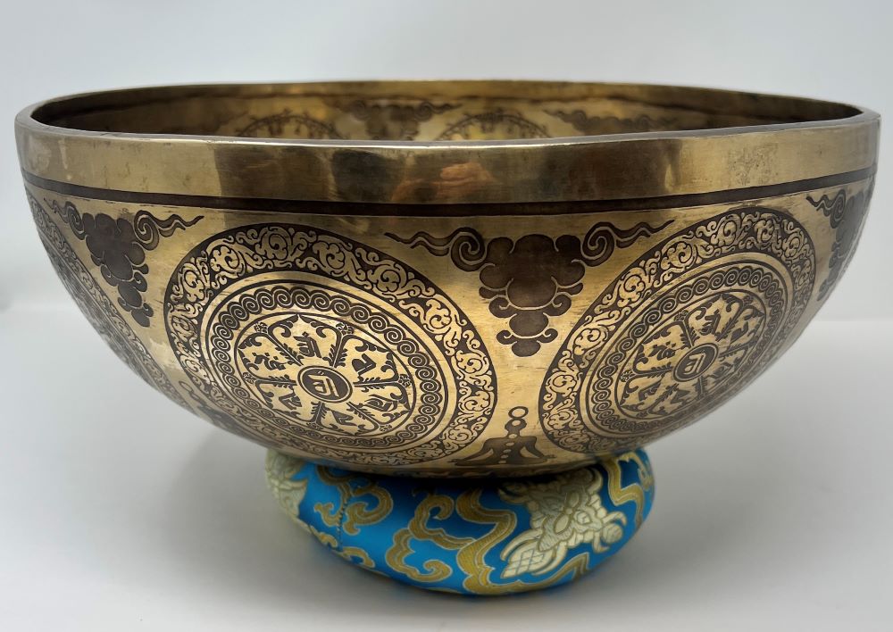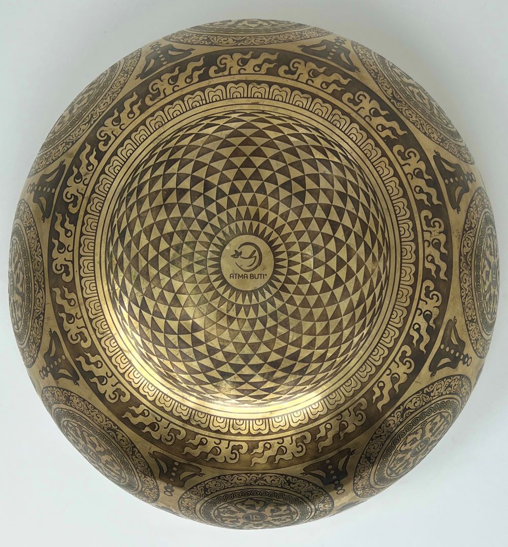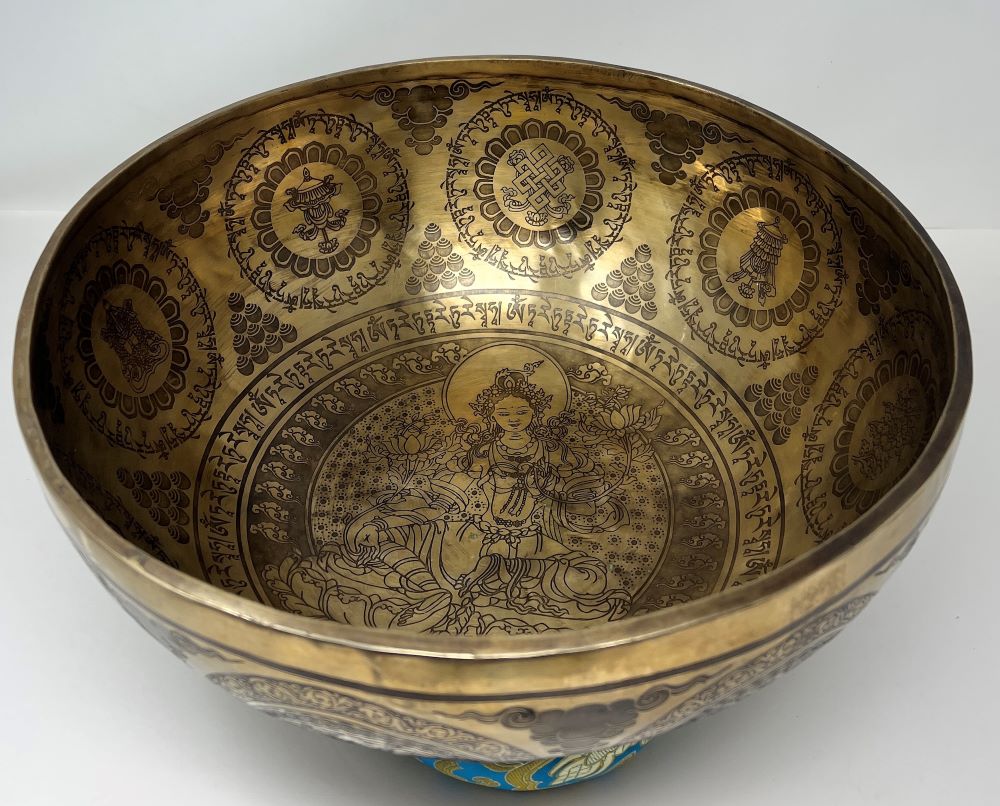 This etched bowl features symbolism including Green Tara, Ashtamangala, the Seed of Life,  and other intricate designs. It is not just beautifully decorated, but is tuned to F (432 Hz) and is perfect for sound healing or other modalities in need of its relaxing tone. This is one of a kind.
