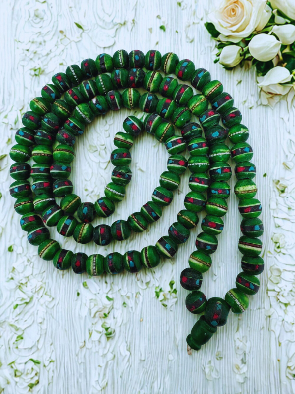 Be the first to review “Green yak bone with turquoise, coral, & copper inlaid- 8mm”