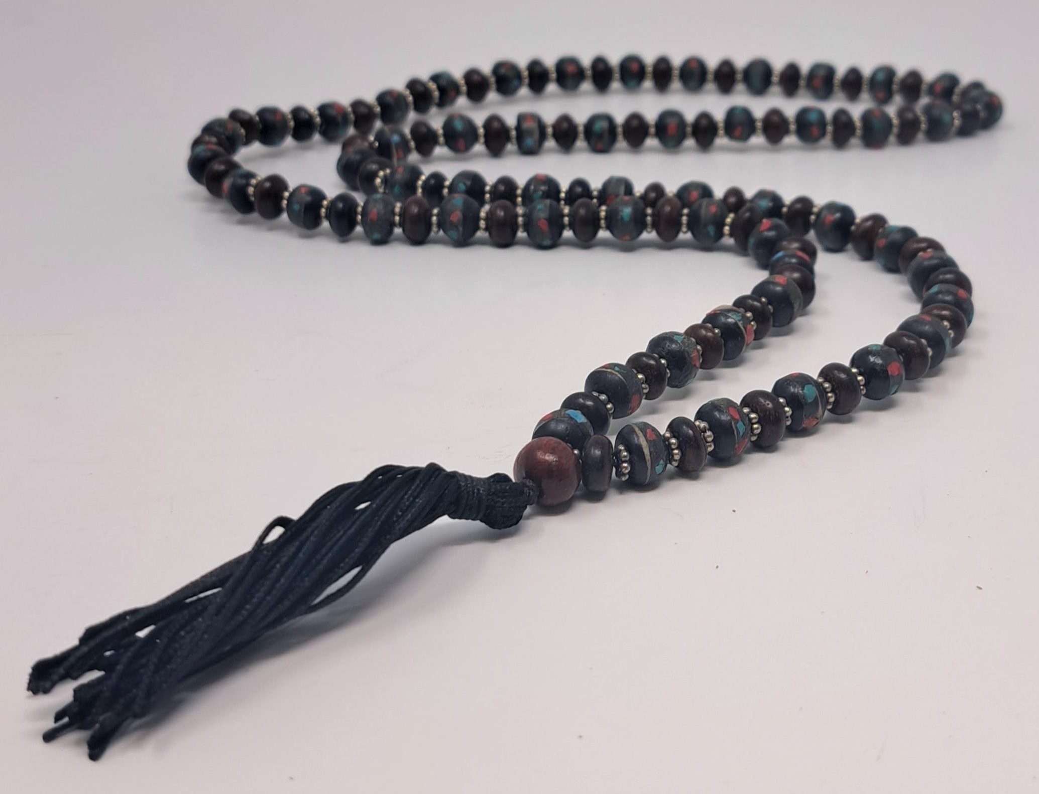 Rosewood and Yak Bone Inlaid with Turquoise and Coral with Cotton Tassel – 8mm